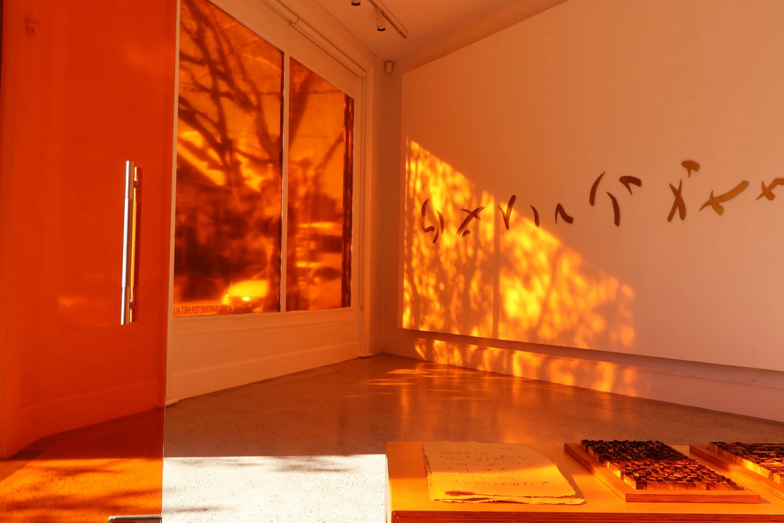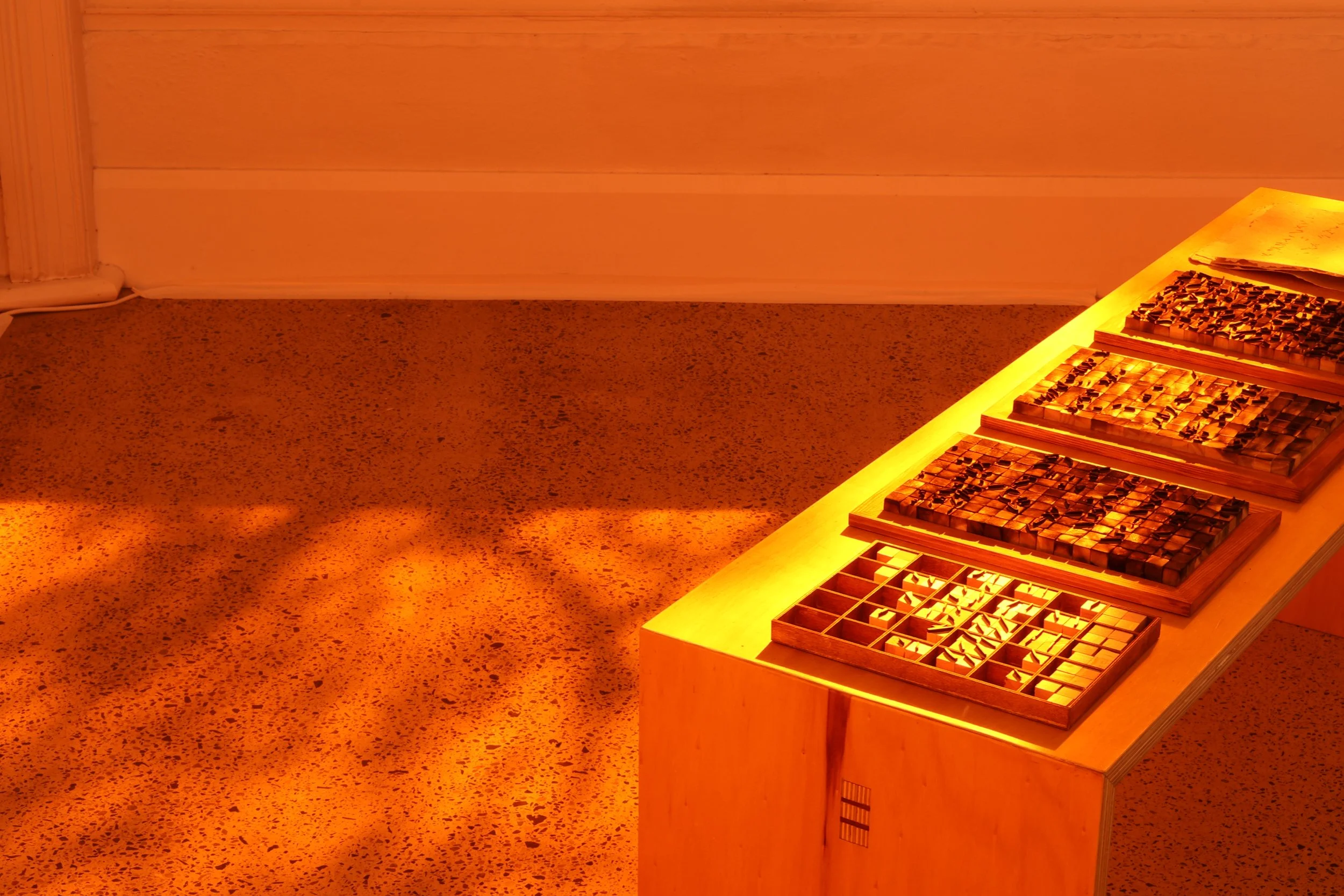 Building on the arcane belief that spirits speak with the living through fire, this exhibition alludes to histories of pyromancy: an ancient practice where the movements, sounds, or colours of flames are read as omens or messages from another world. Images of a bonfire are methodically abstracted into a typographic form— a framework built to give structure to spectral transmissions, and to try and make legible the voices of ghosts.